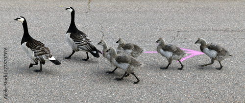 Fototapeta premium Family of Barnacle geese (Branta leucopsis) with chicks crossing road