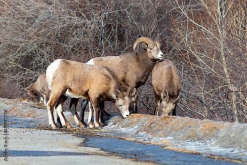 Naklejka premium family of bighorn sheep grazing on side of river, multiple rocky mountain...