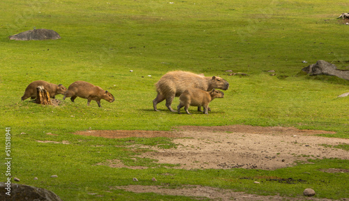 Fototapeta premium Family of capybaras on a green meadow
