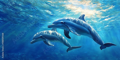 Obraz premium Family of dolphins, including a mother and baby dolphin, gracefully swimming underwater in the clear blue sea. This enchanting scene showcases the beauty of dolphin family dynamics.