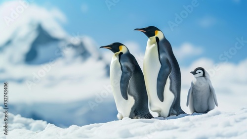 © Tida, Fototapeta premium Family of Emperor Penguins with a chick on the Antarctic ice