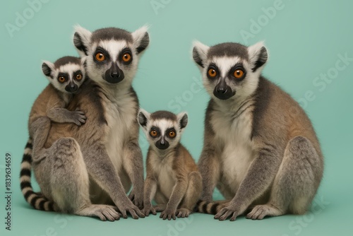 Obraz premium Family of lemurs are sitting together on a green background. The lemurs are...
