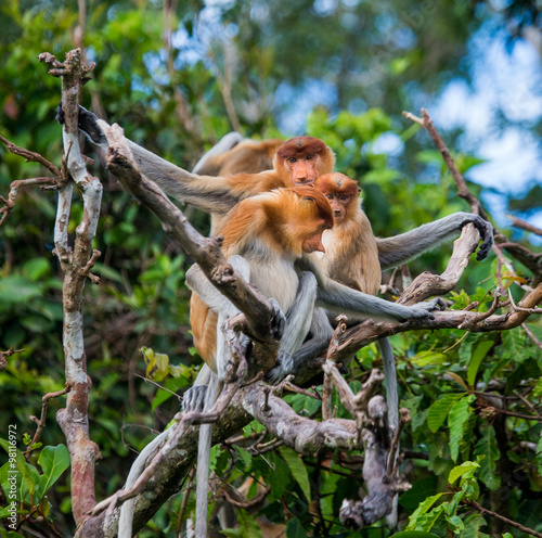© gudkovandrey, Naklejka premium Family of proboscis monkeys sitting in a tree in the jungle. Indonesia. The island of Borneo (Kalimantan). An excellent illustration.