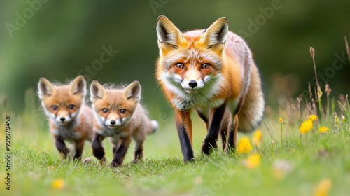 Obraz premium Family of Red Foxes in a Sunny Meadow