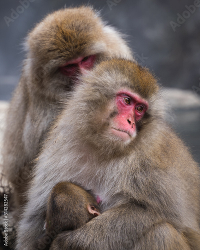 Fototapeta premium Family of Snow Monkeys in Jigokudani Snow Monkey Park cleaning