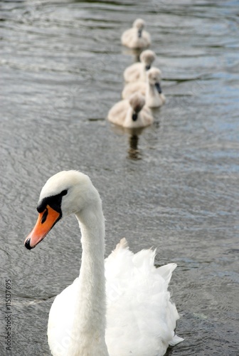 © brusni4ka, Fototapeta premium Family of white swans on a pond