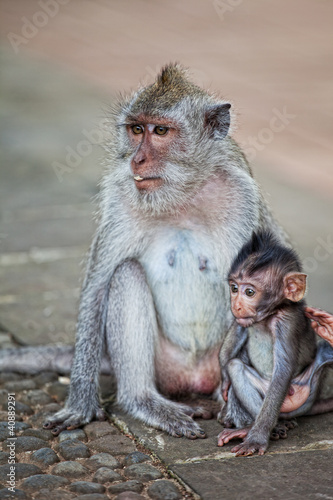 © Shchipkova Elena, Fototapeta premium family of wild monkeys on road elicits meal