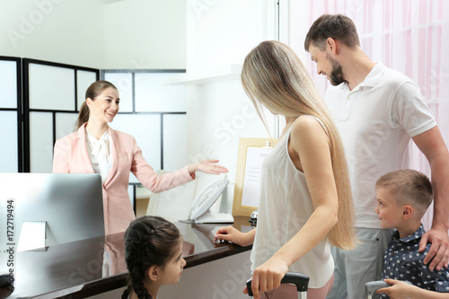 © Africa Studio, Fototapeta premium Family on reception at hotel