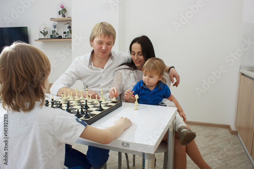 © Saksoni, Fototapeta premium Family playing chess on a table at home