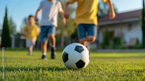 © abdlkerim, Fototapeta premium Family playing soccer in the backyard, active play,