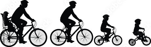 Fototapeta premium Family riding bicycles silhouette, parents and children cycling together, outdoor activity illustration, healthy lifestyle concept, bike riding vector art