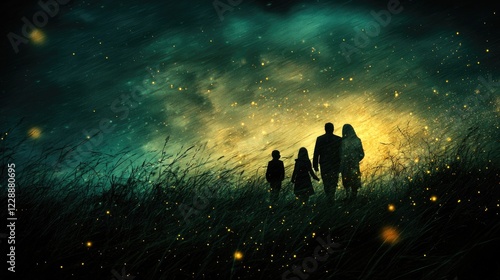 © Iswanto, Fototapeta premium Family silhouette, night field, fireflies, hope, fantasy, family photo