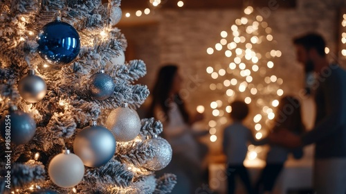 © Botboy, Fototapeta premium Family singing Christmas carols beside a silver tree with blue and white ornaments, candles flickering around.