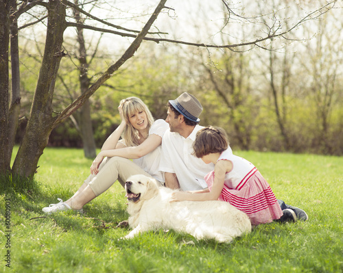 © MDBPIXS, Obraz premium Family sitting in park with dog