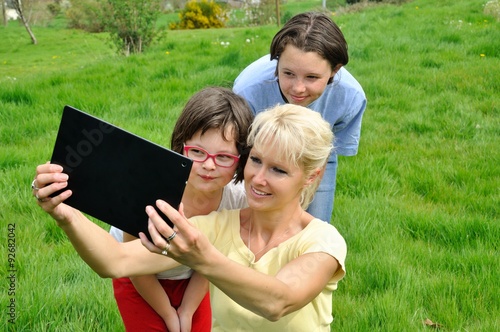 © Heliosphile, Fototapeta premium Family sitting on the lawn and using digital tablet