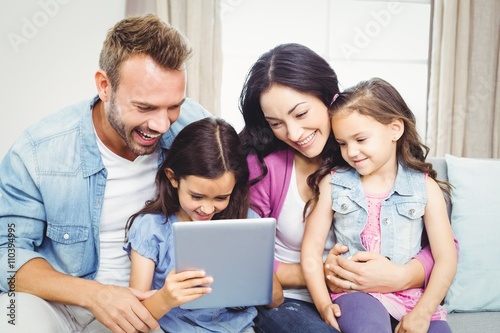 Fototapeta premium Family smiling while looking in digital tablet