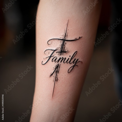 Obraz premium "Family" Tattoo on Arm with Distressed Style and Sharp Lines, Emphasizing...