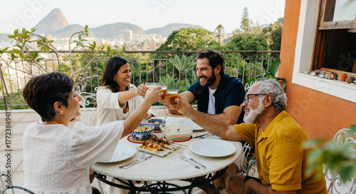 Obraz premium Family toasting to a barbeque meal on a balcony in Rio