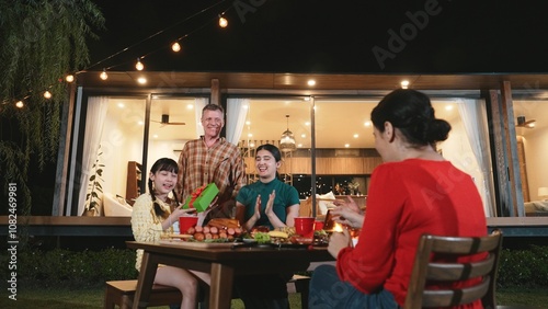 Naklejka premium Family together celebrate anniversary in garden. Senior give gift to...