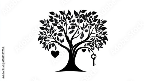 © Zeva, Obraz premium Family tree silhouette, heart, key, white background, genealogy chart
