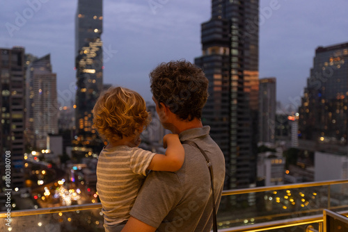 © Song_about_summer, Naklejka premium family trip to Bangkok, parent with child looking at modern buildings in Bangkok, Thailand by night, viewpoint