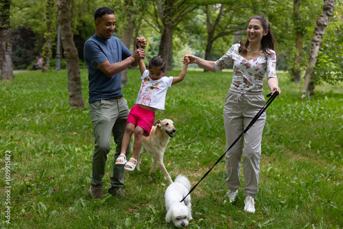 Obraz premium Family walking dogs, parents lifting young girl during outdoor playtime under...