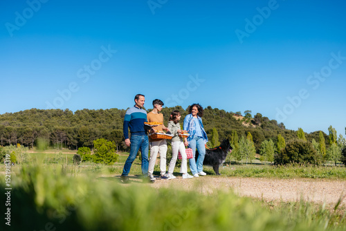 Fototapeta premium Family walking through a park, carrying picnic baskets and accompanied by their dog, on a beautiful sunny day