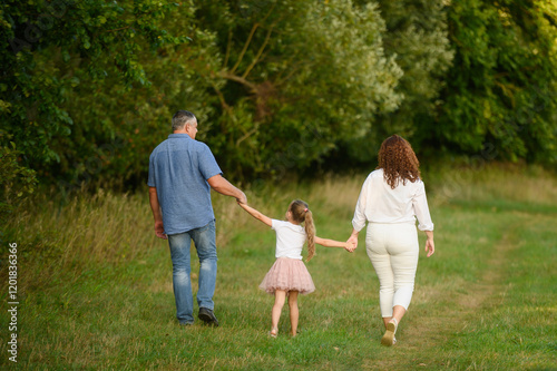 © GRON777, Obraz premium Family walking together in park on summer. Mom, dad, daughter spend time together walking along path holding hands, with backs to camera. Family, love and concept of parenthood, happy childhood.