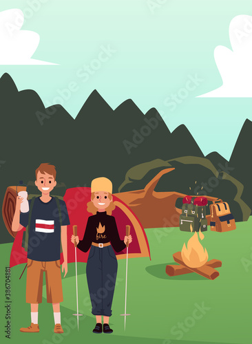 Fototapeta premium Family with children concept flat icons set of house, traveling, spending...