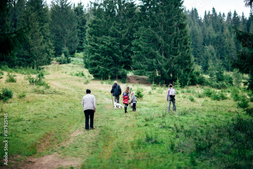 Obraz premium Family with dog goes to forest, vacation