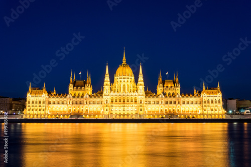 Fototapeta premium Famous Budapest parliament at the river Danube during blue hour from the front