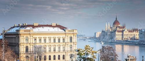 © Horváth Botond, Obraz premium Famous Chain Bridge in winter in Budapest, Hungary