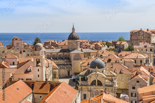 © dbrnjhrj, Fototapeta premium Famous clock tower of Dubrovnik, Croatia. Tower built in Main Street of Old city Dubrovnik - Stradun in XV Century. Dubrovnik is one of most prominent tourist destinations in Mediterranean.