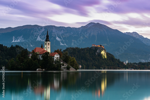 © marcin jucha, Fototapeta premium Famous Lake Bled in Slovenia with Church on Island. Long Exposure Photography