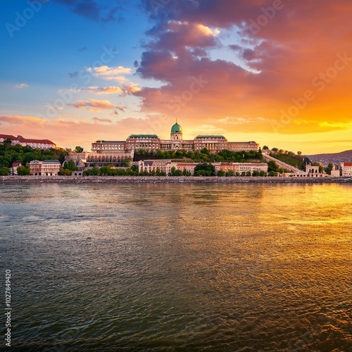 © Donald, Naklejka premium famous royal palace of buda hungary in sunset