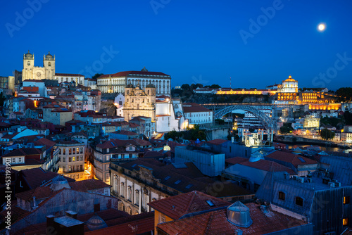 © Frédéric Prochasson, Fototapeta premium Famous view of Porto by night with moon,