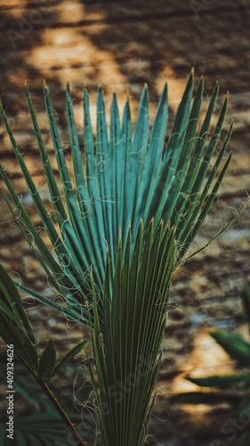 © JuanMartinVidrio, Obraz premium Fan palm on the background. Green leaf. Ornamental plant