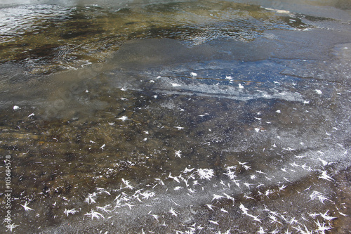 Obraz premium Fancy outgrowths of hoarfrost on ice of the thawing river in the spring