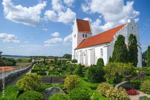 Fototapeta premium Fanefjord Kirke auf Møn mit Kirchengelände und Blick auf das Wasser des Fjords