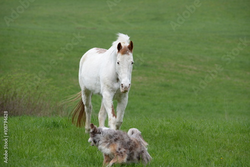 Fototapeta premium fang mich, Hütehund läuft von Pferd weg