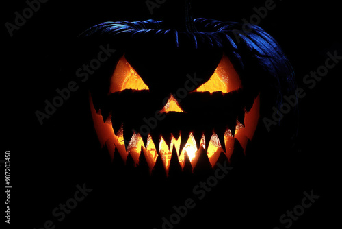 Naklejka premium Fanged jack-o'-lantern isolated in the dark.
