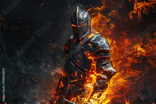 © Oleksandr, Naklejka premium Fantastic beautiful royal knight in iron armor guards castle chambers, abstract vivid composition consists of fictional unreal fantastic vision on background