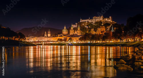 © jenyateua, Obraz premium Fantastic colorful evening view on Salzburg historical city. Castle Hohensalzburg with night street light and perfect reflection. concept ideal resting place. Popular travel and historical center.