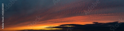 Fototapeta premium Fantastic dark thunderclouds at sunrise, wide panorama