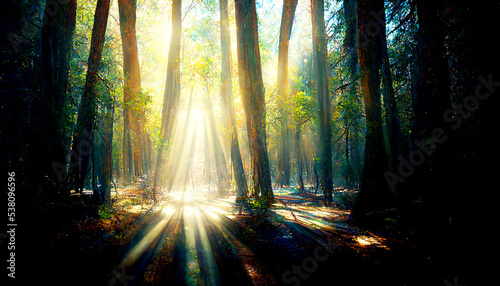 Obraz premium Fantastic deep forest landscape background, dense trees and grass