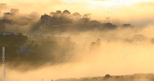 © Nguyen, Fototapeta premium Fantastic foggy village in the sunlight in Dalat, Vietnam