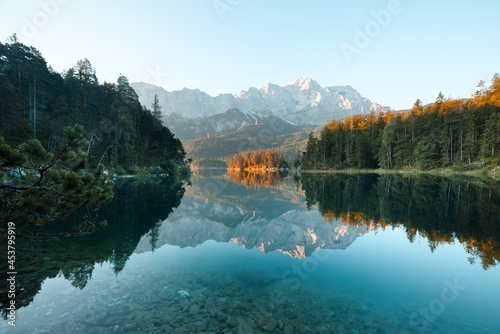 Naklejka premium Fantastic morning on mountain lake Eibsee, located in the Bavaria, Germany....