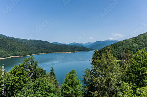 Obraz premium Fantastic panorama of mountain lake with overcast sky of Vidraru Lake....