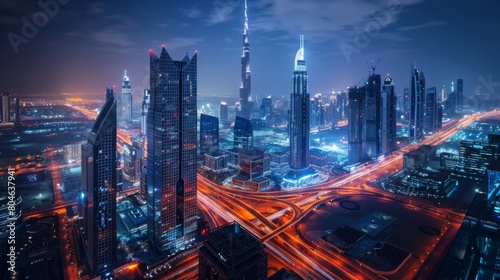 © Plaifah, Fototapeta premium Fantastic rooftop view of a big modern city architecture at night with roads. Business bay, Dubai, United Arab Emirates.