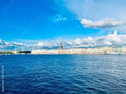 © Oksana, Fototapeta premium Fantastic white clouds at the city river, city river view, summer day